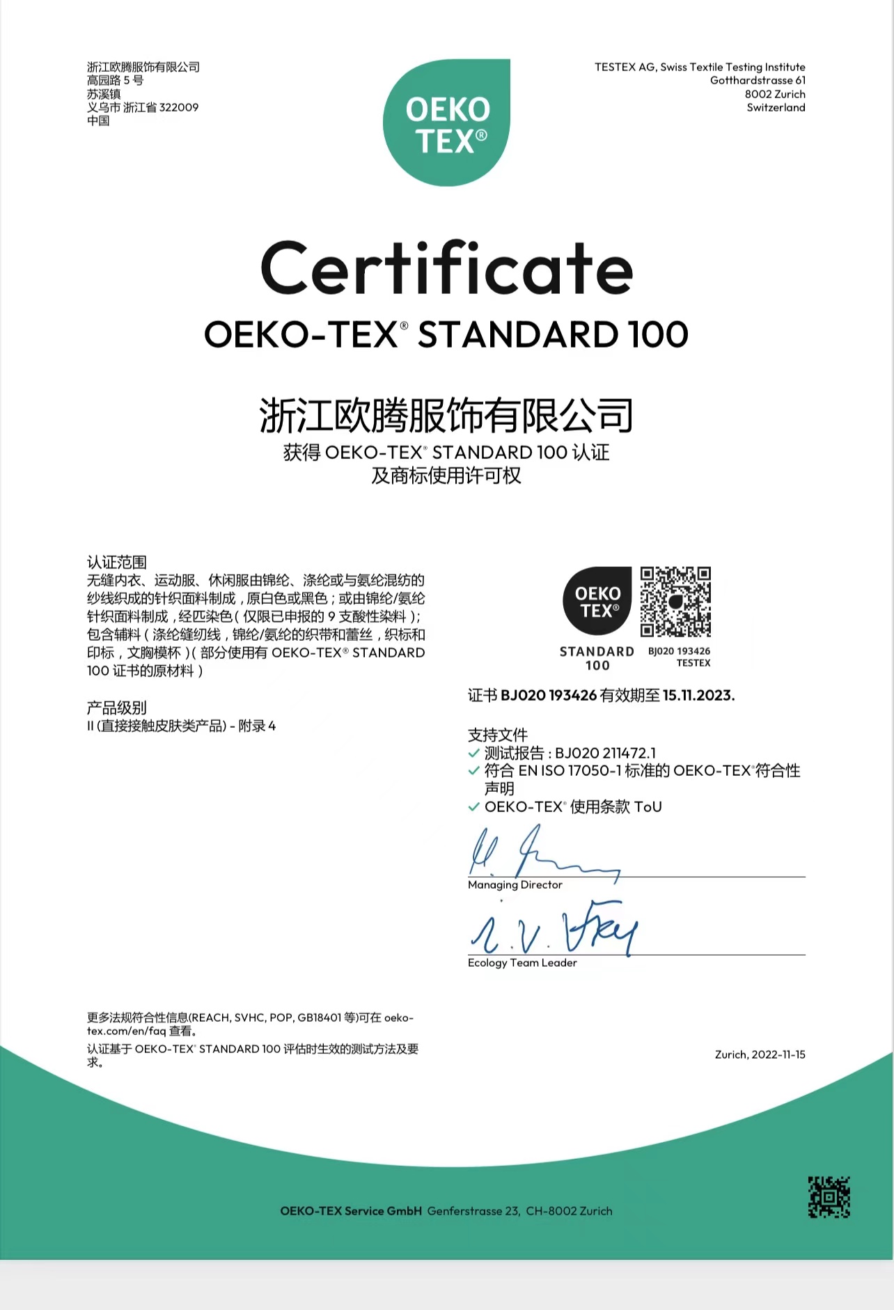 浙江歐騰服飾有限公司位于世界小商品之都-義烏。創(chuàng)立于2015年,是一家專業(yè)生產(chǎn)無縫針織運(yùn)動服飾和內(nèi)衣的工貿(mào)一體企業(yè),擁有自主出口權(quán)。 工廠的占地面積約16000平方米 ,引進(jìn)了大型圣東尼、高騰等多種先進(jìn)的制衣設(shè)備300余臺。月產(chǎn)能可達(dá)90萬件。 歐騰服飾每年投入近百萬資金打樣開發(fā)新產(chǎn)品,有著一支高素質(zhì)設(shè)計、技術(shù)員工隊伍。工廠先后通過了ISO 9001質(zhì)量管理體系認(rèn)證、BSCI認(rèn)證、GRS認(rèn)證、OEKO-TEX國際生態(tài)紡織品認(rèn)證等多項(xiàng)專利檢測報告。可提供OEM&ODM服務(wù)。歐騰服飾以一套完整、科學(xué)的質(zhì)量管理體系,生產(chǎn)的服裝從原材料紗線到成衣,質(zhì)量完全能夠滿足國內(nèi)、國際質(zhì)量要求。獲得了客戶一致好評。工廠先后獲得省科技型企業(yè)、國家高新企業(yè)、義烏市誠信講信用單位、規(guī)上企業(yè)、信用AAA級等榮譽(yù)。